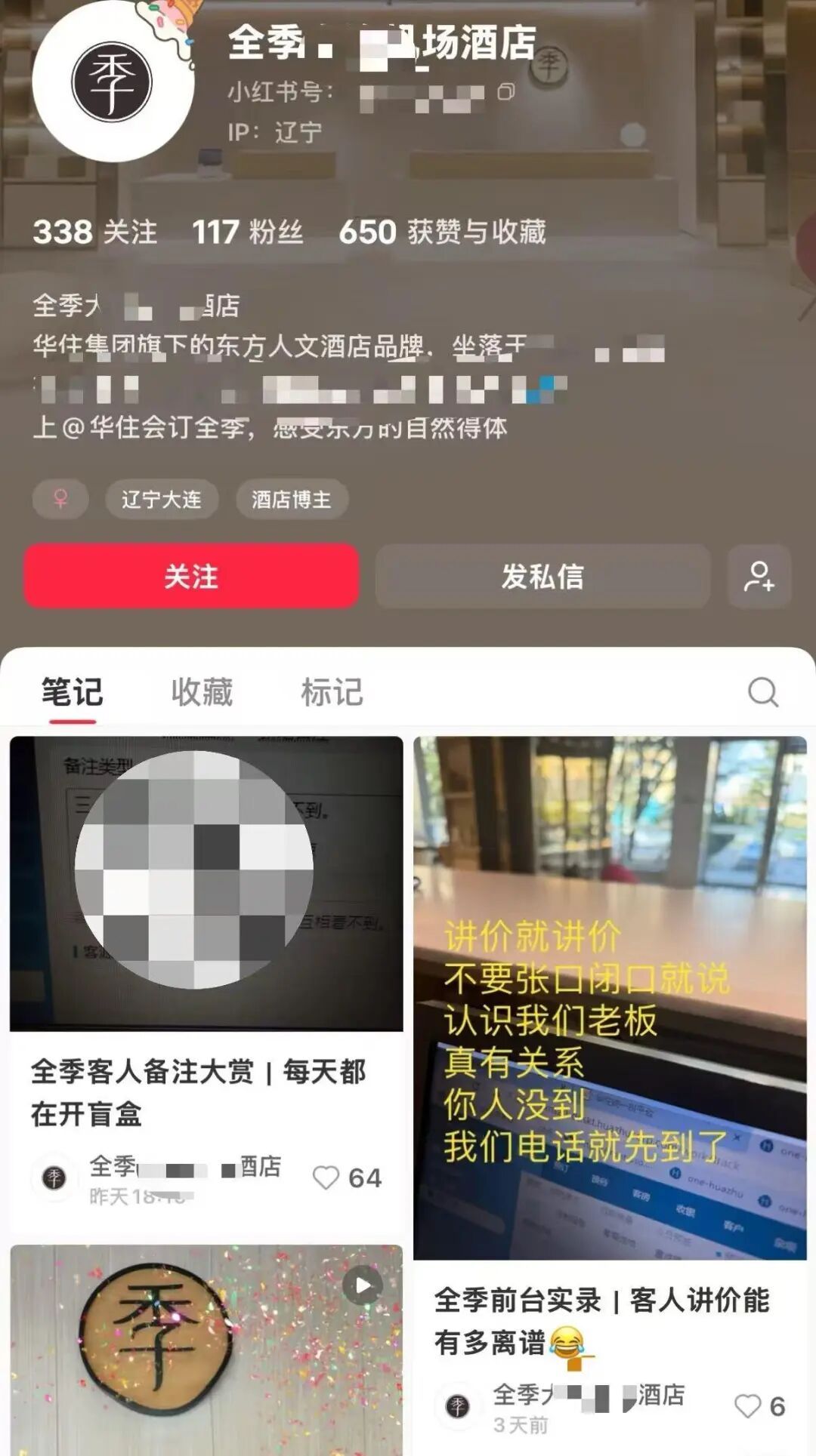 近日,九派新闻注意到,在某社交平台,一家名为“全季大连某某酒店”的账号公开披露多位客人订房时的备注,引发争议。